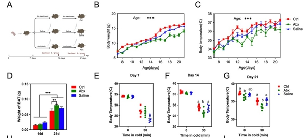 在该研究中,研究人员利用抗生素来干扰布氏田鼠幼体肠道微生物群的建立,并确定了它们对产热能力发育的调节途径。研究表明抗生素给药组幼体的体温低于对照组,且在较晚时间达到恒定(图1)。
