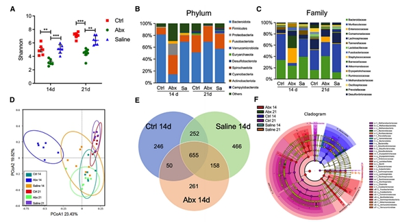 研究人员测定了14日龄和21日龄的三组布氏田鼠的肠道微生物,发现微生物的组成和结构差异显著。抗生素处理显著降低了微生物的alpha多样性,同时干扰了幼年动物肠道微生物群的正常建立过程(图2)。