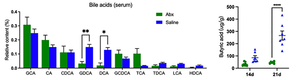 图3. 抗生素处理对布氏田鼠丁酸和胆汁酸的影响