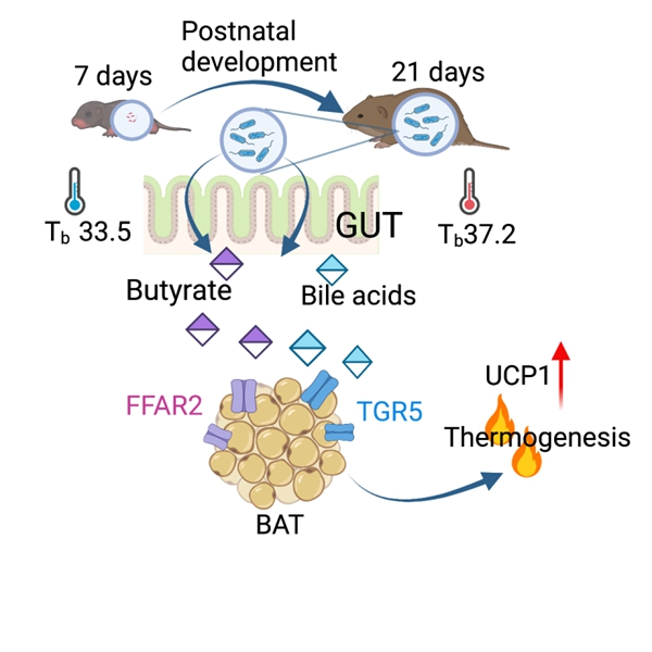 恒温性对哺乳动物的生存至关重要。许多恒温动物在出生后,体温调节能力尚未发育完善,热量散失是威胁其生存的重要因素。晚成型动物的幼体从出生到断乳,产热能力逐渐发育,到断乳后才具有较完善的体温调节能力。因此,恒温动物在胎后发育中体温调节能力的建立一直是学者们关注的问题。研究组的前期研究发现,分布在内蒙古草原的布氏田鼠(Lasiopodomys brandtii)在17日龄前,幼体在冷暴露的情况下不能维持恒定的体温,9-17日龄幼体恒温能力发育迅速,在17日龄后幼体在冷暴露下可以维持恒温,身体的隔热性能也提高(迟庆生等,2005)。肠道微生物对布氏田鼠的产热和体温具有较大的影响(Bo et al. 2020 ISME J),动物出生后是获得肠道微生物的关键时期,但田鼠幼体肠道微生物群的建立对其产热能力发育的影响尚不清楚。
