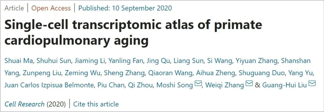 2020年9月10日,中国科学院动物研究所刘光慧研究组、中国科学院北京基因组研究所张维绮研究组和中国科学院动物研究所宋默识研究组合作,于《Cell Research》杂志在线发表题为“Single-Cell Transcriptomic Atlas of Primate Cardiopulmonary Aging”的研究论文。该研究以食蟹猴(Macaca fascicularis)为研究对象,基于高通量单细胞核转录组测序技术,首次绘制了年轻和年老非人灵长类心肺组织的单细胞核转录组图谱,同时结合来源于对应个体的主动脉单细胞转录组数据,对呼吸系统和心血管系统衰老的细胞分子变化规律进行了详细解析。