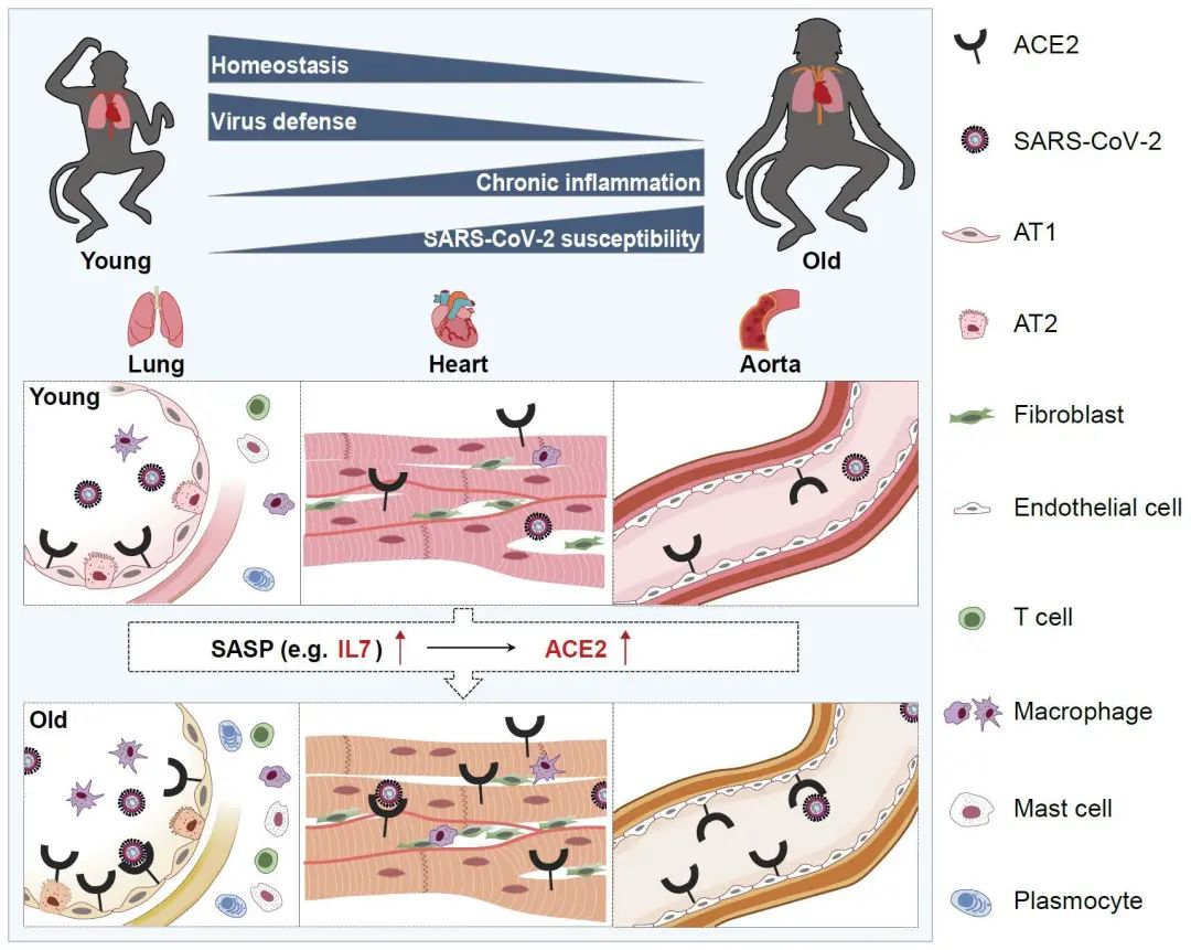 基于单细胞图谱的数据分析,研究人员发现,细胞特异性的炎症反应增加和病毒防御功能受损是非人灵长类心肺衰老的重要特征。其中,肥大细胞、浆细胞和CD8+ T细胞等炎症相关细胞类型在年老个体的肺组织中积累。此外,衰老的心肺系统(尤其是肺组织)中的驻留免疫细胞发生过度活化,并且免疫细胞与基质细胞的炎性互作增强。更为重要的是,随着年龄的增加,新型冠状病毒受体ACE2阳性细胞数目或ACE2表达量在肺泡上皮细胞、心肌细胞和血管内皮细胞中均有增加,为增龄伴随的新冠病毒易感性升高提供了科学依据。