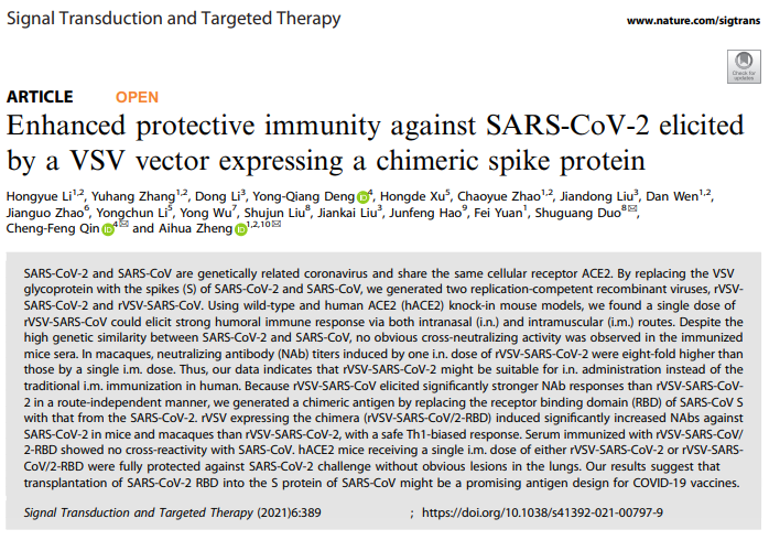 近日,中国科学院动物研究所郑爱华研究组联合军事医学科学院微生物流行病研究所秦成峰研究组并与中国科学院动物研究所实验动物中心多曙光博士合作,在基于水疱性口炎病毒载体的新冠病毒鼻喷疫苗研究开发方面取得进展。相关研究成果近期在Signal Transduction and Targeted Therapy杂志发表,题为“Enhanced protective immunity against SARS-CoV-2 elicited by a VSV vector expressing a chimeric spike protein”。