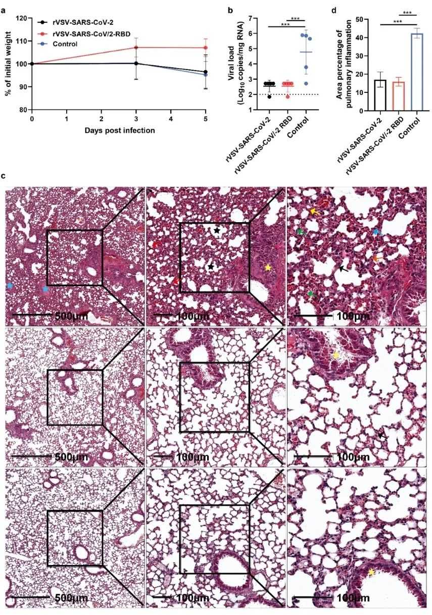SARS冠状病毒与新冠病毒具有亲缘关系,二者刺突蛋白(Spike, S)氨基酸序列75%相同,而且细胞受体都是ACE2。然而,SARS病人相对新冠病人体内产生的中和抗体滴度更高,且持续时间更长。为了提高疫苗的免疫原性,本研究先构建了表达SARS冠状病毒S蛋白的复制型rVSV-SARS-CoV,在此基础上,把SARS冠状病毒的RBD置换成新冠病毒的RBD,获得了表达新冠主要免疫原的嵌合疫苗株rVSV-SARS-CoV/2-RBD(图1)。在小鼠、仓鼠和食蟹猴模型里,嵌合株rVSV-SARS-CoV/2-RBD的抗新冠病毒中和抗体水平约为rVSV-SARS-CoV-2的3倍。单次免疫两种疫苗均可以有效的保护hACE2小鼠模型免受新冠病毒的感染,且嵌合疫苗株rVSV-SARS-CoV/2-RBD的效果明显优于rVSV-SARS-CoV-2(图2)。这些结果为rVSV-SARS-CoV/2-RBD作为SARS-CoV-2的有效候选疫苗的开发奠定了基础。在SARS冠状病毒S中嵌合表达SARS-CoV-2 S RBD的策略也为其他疫苗平台的设计提供了新思路。